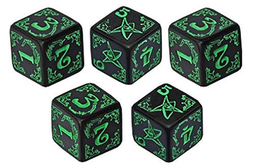The Arkham Horror Dice Set contains five high-quality, crafted, polyhedral dice designed and created by Q-workshop company on license of Fantasy Flight Games. They are cast from hand-carved original sculpts, and feature ornately detailed faces as well as Elder signs on the 5 and 6 sides to indicate successes. 0