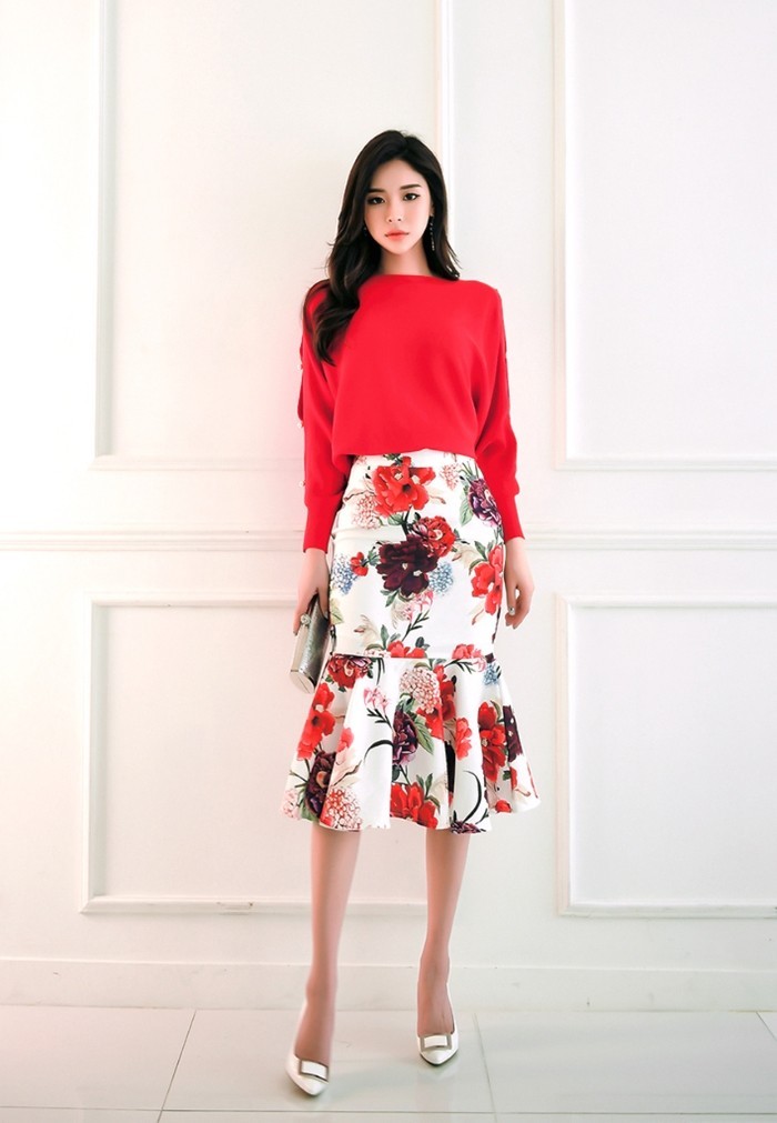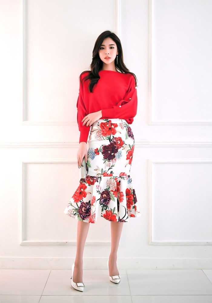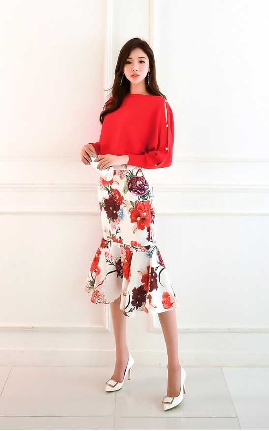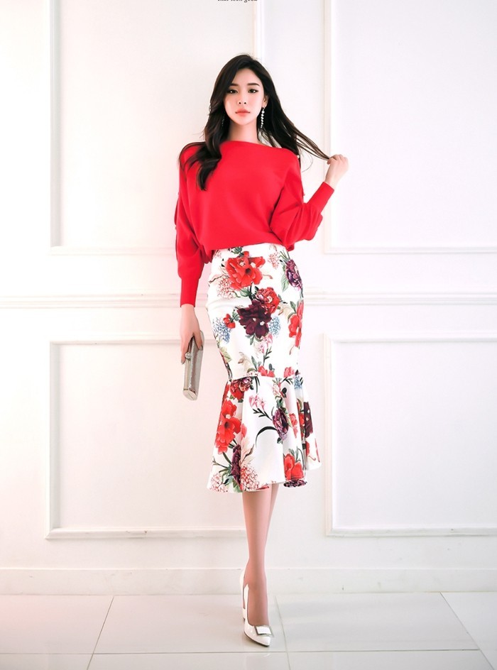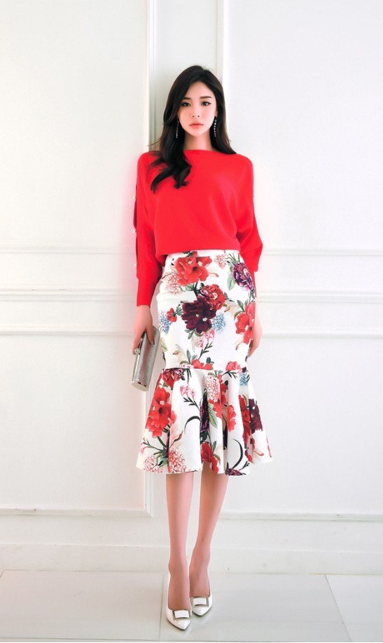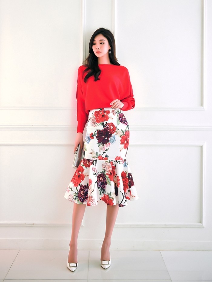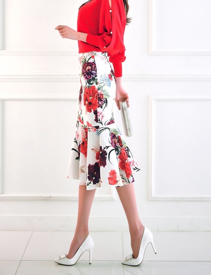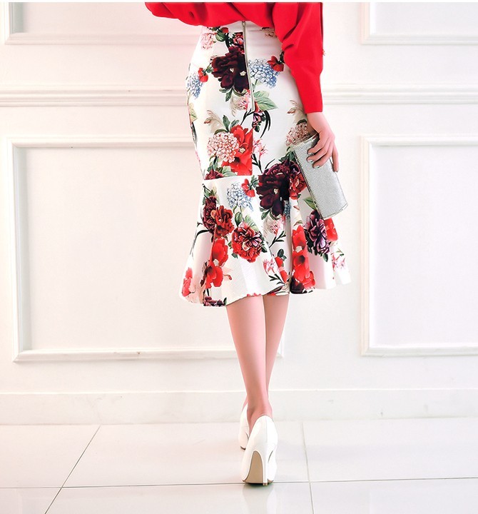 商品名:ペンシルスカート ハイウエスト マーメイドライン 花柄 フラワー 膝丈