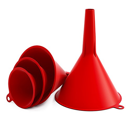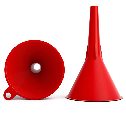 - BRIGHT COLOR – This plastic funnel set comes in red. Not only does that make these funnels easy to see, but you can designate different sizes of funnels for different materials to avoid cross contamination.