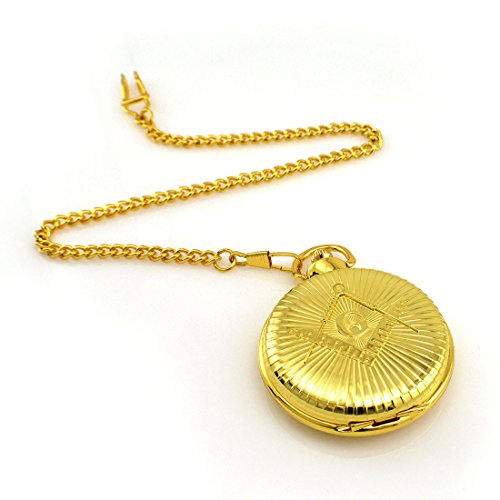 -. Feature : Classic Gold Tone Mason / Masonic Watch Pocket Watch / Gold Tone / 14" chain with clip and gift box / Push button access / Quartz Japan Movement