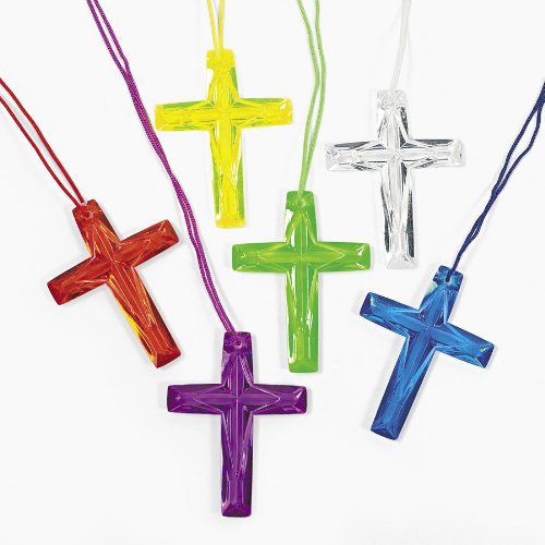 Lot of 48 Plastic Bright Color Crystal Cross Necklaces Religious Party Favors