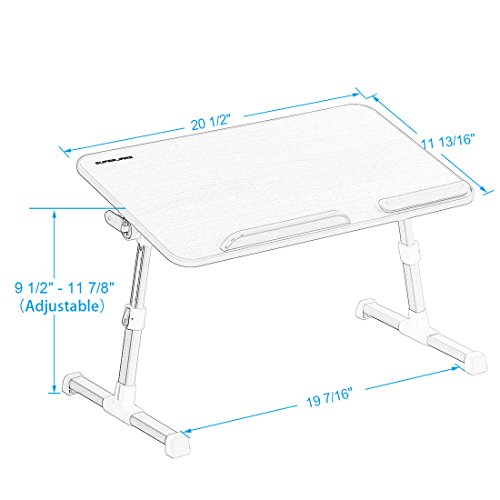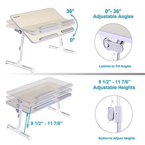 ONE BUTTON OPERATION - Fully assembled, two auto-lock buttons on each legs easily to raise or drop for 5 height positions (adjustable from 9 1/2" - 11 7/8"); Two latches on each side enable tilt to 4 angles (0° 12° 24° 36° ). You can bring your laptop to any perfect heights or angles while lay back on your bed or couch