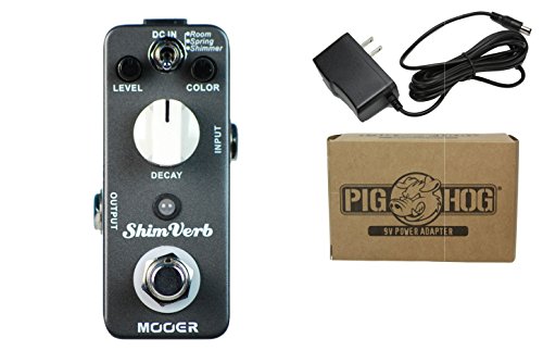 Studio : Mooer Audio Publisher : Mooer Audio Product Description Power Bundle w/ 1 free Items: Item: Pig Hog 9v Power Adapter 3 Reverb Modes: Room, Spring, Shimmer Room: Different sized true acoustics reverb, from room to hall. Spring: Simulates a classic spring reverberation, vintage 60's Surfing sound. Shimmer: Add rich overtone into the reverb sound, spacy, smooth and shining, very popular in Post Rock music. Mooer Audio ShimVerb Reverb Features: ?Full metal shell ?Very small and exquisite ?True bypass ?DC 9V Adapter power supply Reverb Modes: 3 (Room, Spring, Shimmer) Input: 1/4" monaural jack (impedance: 470k Ohms) Output: 1/4" monaural jack (impedance: 100 Ohms) Power Requirements: AC adapter 9V DC (center minus plug) Current Draw: 128 mA Dimensions: 93.5mm (D) × 42mm (W) × 52mm (H) Weight: 170g 0