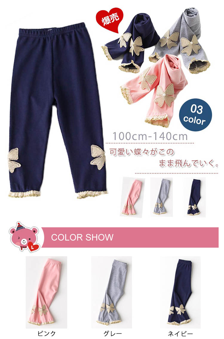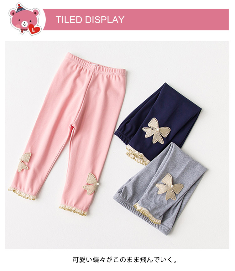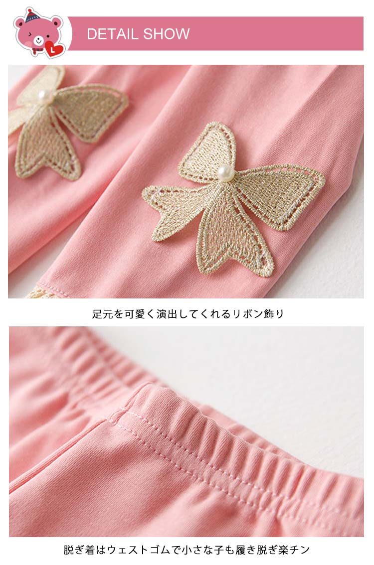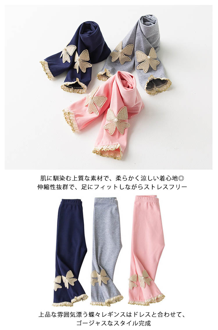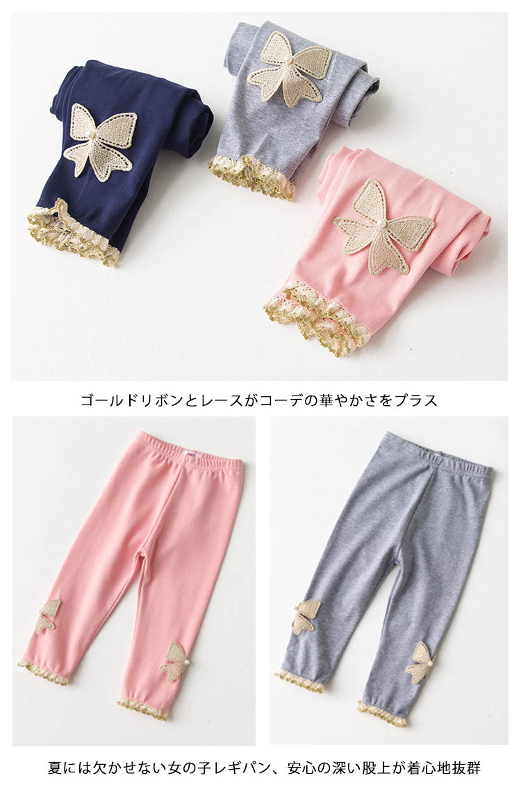 | 可愛い蝶々がこのまま飛んでいく。ゴールドリボンとレースがコーデの華やかさをプラス夏には欠かせない女の子レギパン、安心の深い股上が着心地抜群肌に馴染む上質な素材で、柔らかく涼しい着心地◎伸縮性抜群で、足にフィットしながらストレスフリー上品な雰囲気漂う蝶々レギンスはドレスと合わせて、ゴージャスなスタイル完成 | |