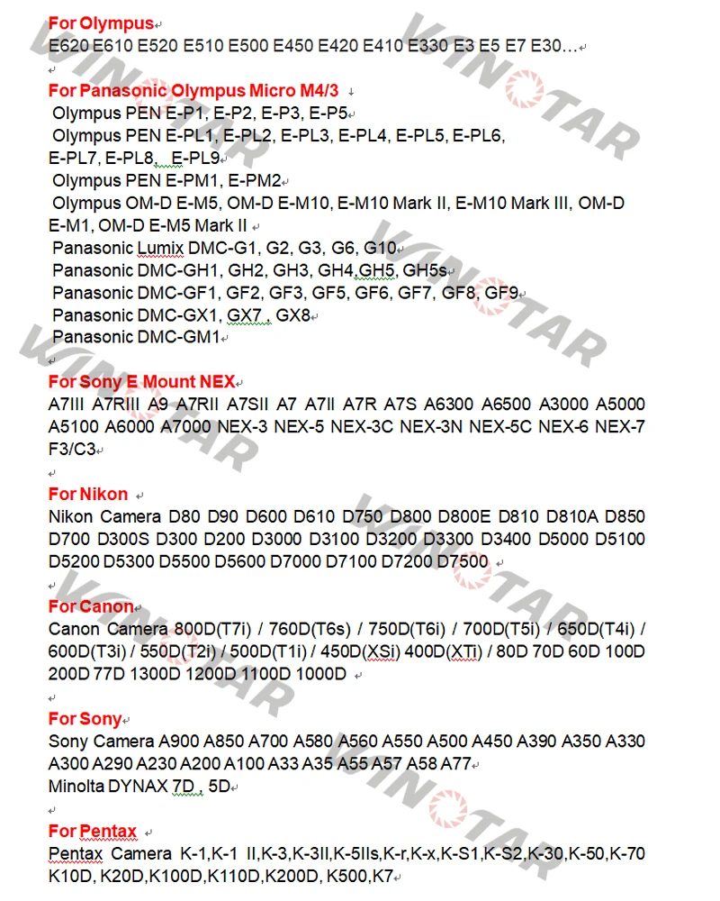Compatible Brand:Canon,Panasonic,Olympus,Pentax,Sony, Minolta,NIKON
