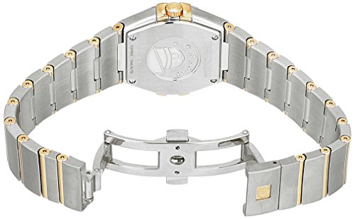 Stainless steel case with a stainless steel bracelet with 18kt yellow gold bars. Fixed 18kt yellow gold bezel. Mother of pearl "griffes" dial with gold-tone hands and diamond hour markers. Dial Type: Analog. Quartz movement. Omega 1376 engine. Scratch resistant sapphire crystal. Pull / push crown. Solid case back. Case diameter: 27 mm. Case thickness: 9 mm. Round case shape. Deployment clasp. Water resistant at 100 meters / 330 feet. Functions: hour, minute, second. Luxury watch style. Watch label: Swiss Made. Omega Constellation Mother of Pearl Dial Stainless Steel and 18kt Yellow Gold Watch 123.20.27.60.55.008.Feature
