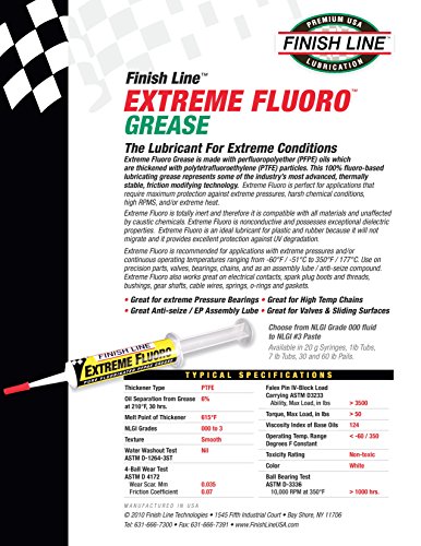 ReleaseDate : 2009-06-12 Studio : Finish Line Publisher : Finish Line Binding : Sports Product Description Extreme Fluoro Grease is made with 100% pure DuPont fluorinated ingredients. Recommended for precision parts and especially bearings (including ceramic). Perfect for those seeking a significant drop in friction and maximum protection against extreme pressures and/or extreme rotational heat. Also works great on cable wires, derailleur pivots, stanchions, gaskets, pedal springs and as a 'clean' alternative to conventional anti-seize compounds. Extreme Fluoro often provides 'lubricated for life' protection! 0