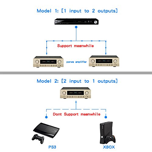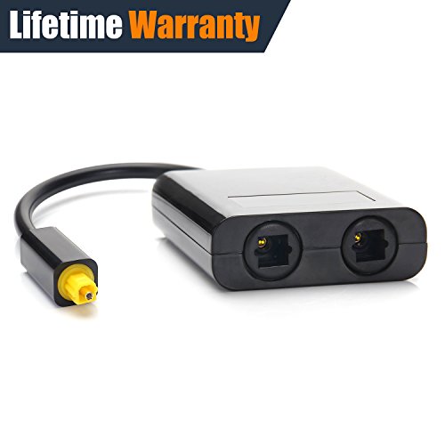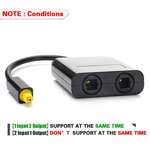 Note:【1 Input 2 Output】Two outputs devices can work at the same time,such TV to soundbar and audio receiver.【2 Input 1 Output】 Two input device only one device work,please turn off one of input device,otherwise, there will be noisy sounds.Optical Audio Splitter 1 to 2 Adapter Fiber Optic TOS Link New Converter.This splitter/adapter allows you to connect one toslink optical audio source and split it into two signals.Perfect for connecting your CD player, DVD player, or other digital audio source to both your receiver and recorder.Specification:Colour: BlackInput: 1 Male ToslinkOutput:2 Female ToslinkProduct Size: 55 X 43 X 16 mm approxThe Cable length: 180 mm approxPackage included: 1 x Optical Fibre Audio Splitter. 0 |