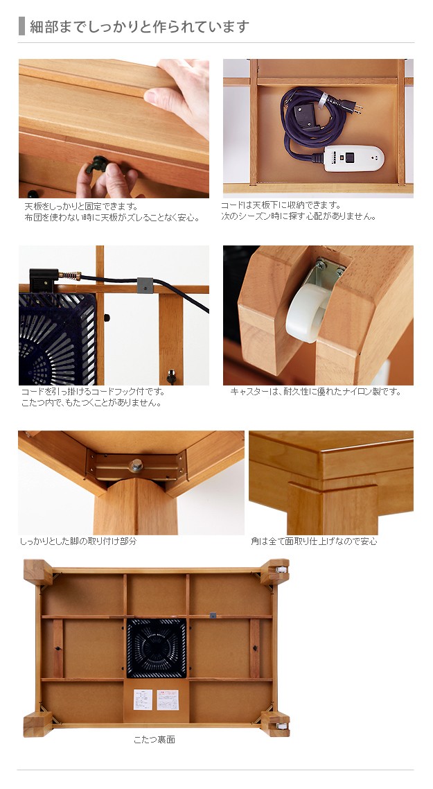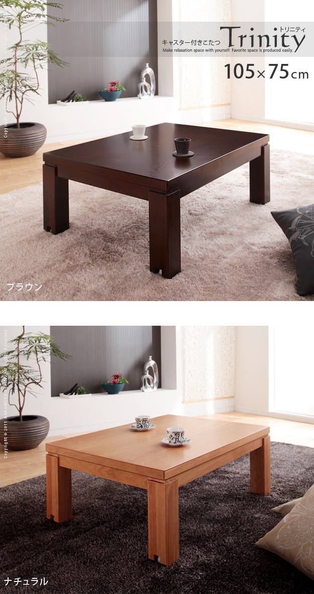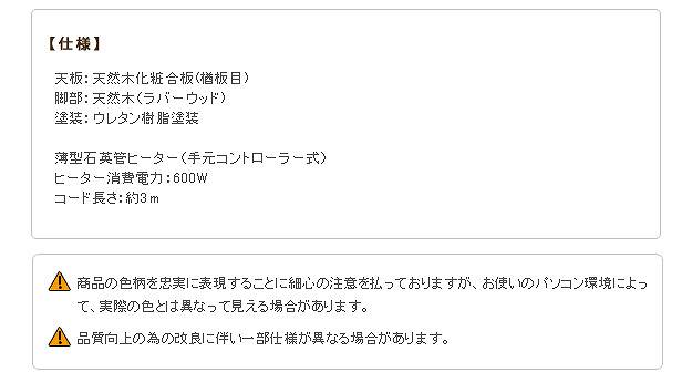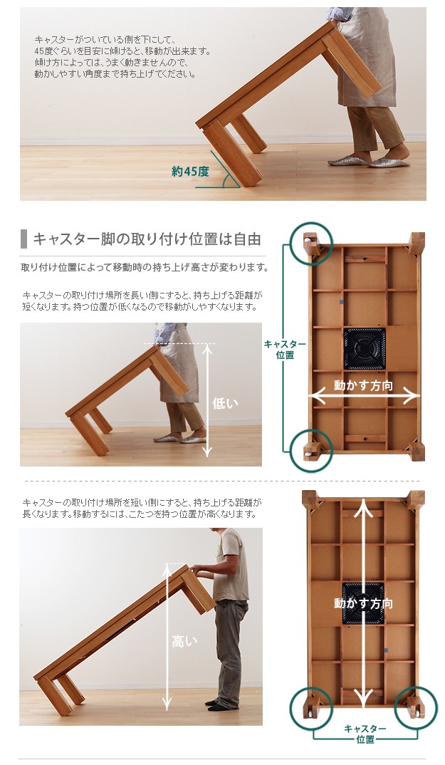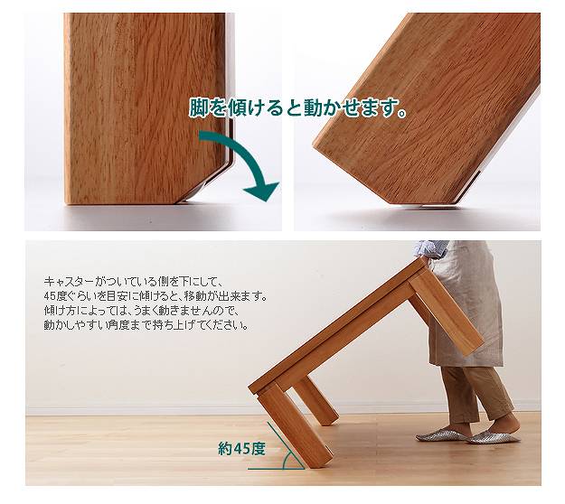 ●商品について:脚部のキャスターで移動ラクラク♪のキャスター付きコタツです。木目の美しい天板と直線的でシンプルなデザインも魅力☆オフシーズンにはローテーブルとして。薄型石英管ヒーターですので邪魔になりません。消費電力600w(手元コントローラー式)