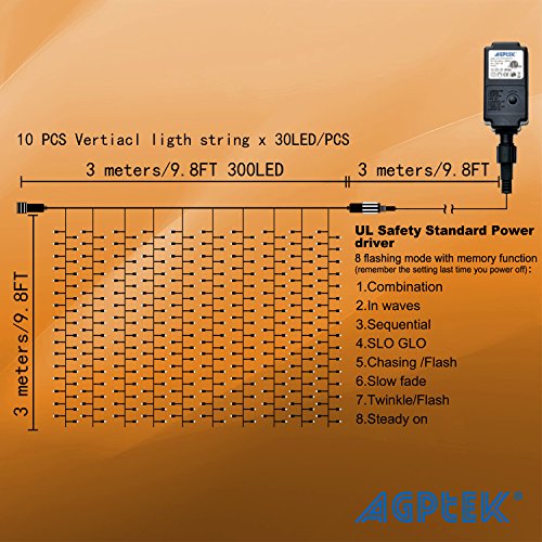 FULL Waterproof Safety Fairy Lights, AGPtEK Decorative Starry Curtains Lights with 8 Models for Indoor/Outdoor, Party, Festivals, Garden, Patio, Bedroom - 3 M X 3M 300 LED - RGB Multi-color
