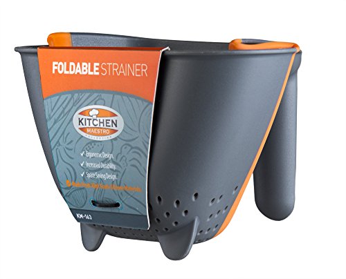 -. Feature : Collapsible Colander Holds up to 1.75 Quart when opened, and collapses to save on storage space. / The handle is designed to hook over most sink dividers. Also supports the colander uP.R.Ight, for hands-free straining. / Wide front and square design help to empty the rinsed food. / Small draining holes are ideal for grains, rice, and quinoa. However, it works just as well for pasta, vegetables, fruits, etc. / Sturdy heavy duty build, FDA approved, BPA Free, Dishwasher safe, 1 Year Warranty by Kitchen Maestro.