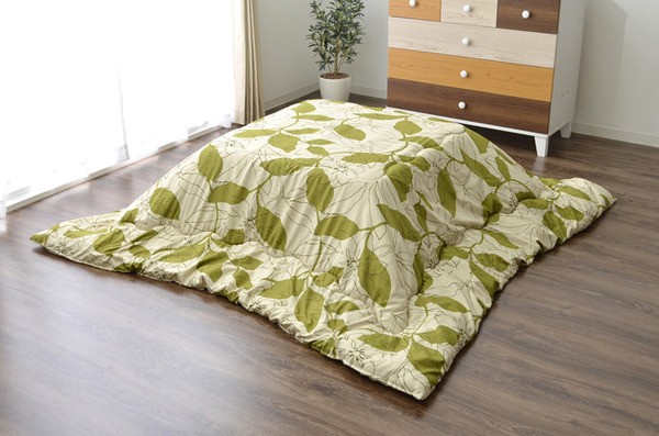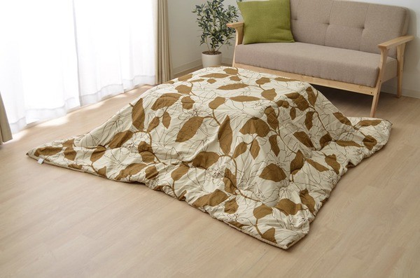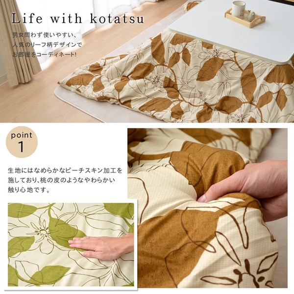 やわらかな肌触りのピーチスキン加工を使用したこたつ布団です。優しい肌触りが特徴です。シンプルなリーフ柄なのでお部屋にも合わせやすいです。薄手なので折りたたんでもかさばらず、コンパクトに収納できます。部分暖房のこたつは電気代もお得です。