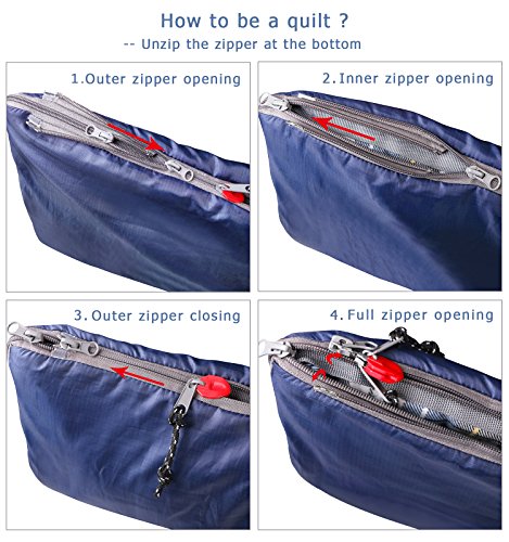 Open the bag completely as a quilt (Come with two zippers : a side zipper & a bottom zipper which extending to the side) -- 1. unzip the side zipper from bottom to top; 2. unzip the bottom zipper; 3. unzip the side zipper again but from top to bottom. Then it can be openned totally. CLOSE the bag -- 1. zip up the side zipper from bottom to top; 2. zip up the bottom zipper. Machine washable