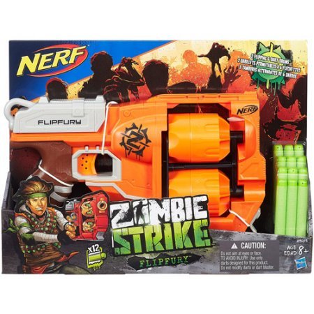 -. Binding : Toy -. Brand : Zombie Strike FlipFury Blaster -. Color : Brown , Gray , Orange -. EAN : 4106289671910 -. Feature : Nerf FlipFury blaster has 2 flipping dart drums that hold 6 darts apiece / Zombie Strike FlipFury blaster fires up to 12 darts without reloading / When one drum is empty, flip to the other one / Blaster toy includes 12 Zombie Strike darts / Warning: choking hazard - Small parts will be generated. Not for children under 3 years -. IsAdultProduct : 0 -. ItemPartNumber : A9603 -. Label : Nerf -. Manufacturer : Nerf -. MPN : A9603 -. PartNumber : A9603 -. ProductGroup : Toy -. ProductTypeName : TOYS_AND_GAMES -. Publisher : Nerf -. Size : 2.99 x 15.00 x 10.98 Inches -. Studio : Nerf -. Title : Nerf Zombie Strike FlipFury Blaster fires up to 12 darts without reloading