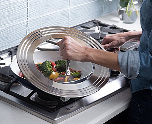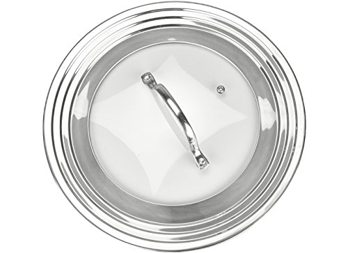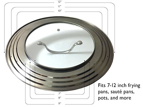 Product Description Never search for a matching lid again! This durable 18/8 12" diameter x 2.5" H stainless steel universal lid has a polished finish with a tempered glass insert that allows you to see your food while it's cooking. It fits all frying, saute pans, sauce pans, and stock pots that are between 7 and 12 inches in diameter. Oven safe to 425°F and dishwasher safe, this durable lid will become a kitchen staple in no time. No more going through the hassle of keeping and storing multiple lids, the Modern Innovations Stainless Steel and Glass Universal Lid has you covered.Feature