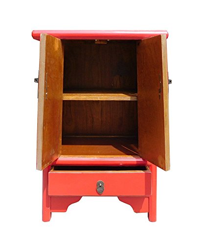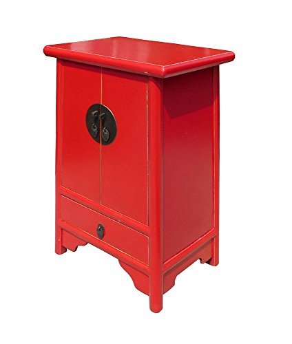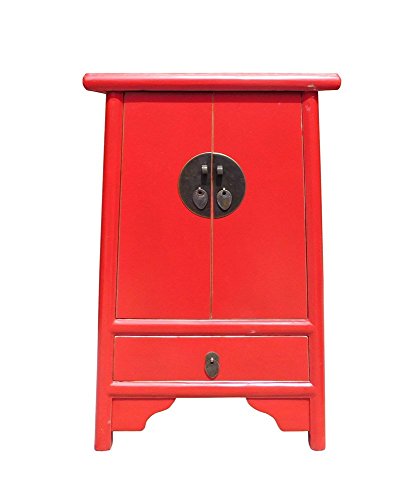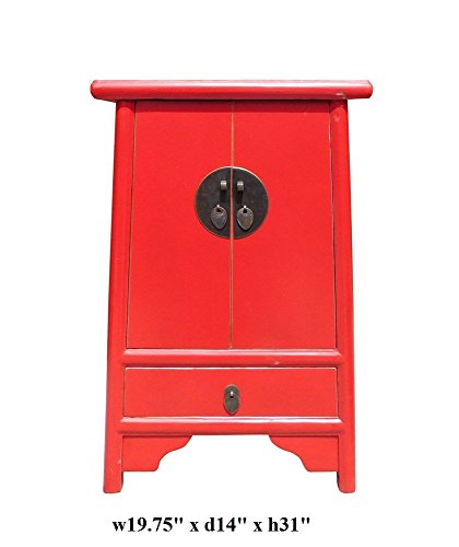Studio : orientliving Publisher : orientliving Product Description This is an oriental style end table nightstand in minor A shape design and painted with red surface color. A simple round moon face hardware is used as an accent. Dimensions: w19.75"x d14"x h31" Origin: China Material: Wood Condition: Hand made, variation in the paint marks 0