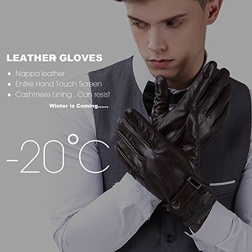 Material: 100% ITALIAN NAPPA TOP GENUINE LEATHER Lining: CASHMERE LINING Color: BLACK/BROWN Touchscreen Function Capacitive touchscreens work by sensing the conductive properties of your skin. Nanotechnology integrated into the leather of the gloves mimics the conductive properties of the human skin; this makes the gloves touchscreen compatible. It functions independent from the human skin, this enables us to fully insulate the gloves with a layer of soft 100% cashmere lining. Size Chart: Measurement for men gloves: Size S= 8" - Middle finger = 3.19" Size M= 8.5" - Middle finger = 3.35" Size L = 8.9" - Middle finger = 3.46" Size XL= 9.4" - Middle finger = 3.54" Size 2XL= 9.8" - Middle finger = 3.62" Because the leather gloves for men are sent when it just finished, so when you receive it, maybe it will smell bad. This is normal. But you just need to place gloves at ventilated place several days. The smell will gone. Don't do this: 1. Rub on sharp or rough objects 2. Place under the sun directly 3. Dry it with a hair dryer 0