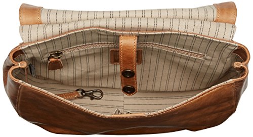 Saddle bag in distressed leather featuring fold-over flap and adjustable buckle strap