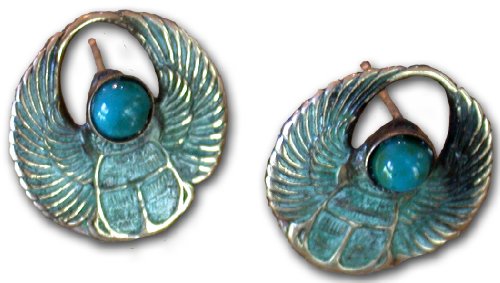 -. Feature : Verdigris Patina Solid Brass Egyptian Motif Scarab Earrings - Turquoise / Earrings are .6 inchwide by .6 inch high / 14k gold filled posts / Genuine Turquoise Cabochons