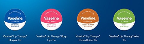 1-Vaseline® Lip Therapy® Aloe Tin 0.6 oz Clinically proven to help heal dry lips. Comes in a premium steel tin inspired by our original look. Provides long-lasting moisturization to help heal dry lips Non-sticky, non-greasy formula spreads on smoothly Fresh aloe scent delights your senses Gives lips a natural, glossy shine Provides the healing benefits of Vaseline® Jelly in a formula custom-made for lips BEST FOR: DRY, CRACKED LIPS 2-Vaseline® Lip Therapy® Original Tin Clinically proven to help heal dry lips. Comes in a premium steel tin inspired by our original look. Provides long-lasting moisturization to help heal dry lips Non-sticky, non-greasy formula spreads on smoothly Unscented formula Gives lips a natural, glossy shine Provides the healing benefits of Vaseline® Jelly in a formula custom-made for lips BEST FOR: DRY, CRACKED LIPS 3-Vaseline® Lip Therapy® Rosy Lips Tin 0.6 oz Clinically proven to help heal dry lips. Comes in a steel tin inspired by our original look. Provides long-lasting moisturization to help heal dry lips Non-sticky, non-greasy formula spreads on smoothly Sweet fragrance with hints of rose, vanilla, and red berry Gives lips a light tint and natural, glossy shine Provides the healing benefits of Vaseline® Jelly in a formula custom-made for lips BEST FOR: DRY, CRACKED LIPS 4-Vaseline® Lip Therapy® Cocoa Butter Tin Clinically proven to help heal dry lips. Comes in a steel tin inspired by our original look. Provides long-lasting moisturization to help heal dry lips Non-sticky, non-greasy formula spreads on smoothly Appealing cocoa and vanilla scent Gives lips a natural, glossy shine Provides the healing benefits of Vaseline® Jelly in a formula custom-made for lips BEST FOR: DRY, CRACKED LIPS. Made in UK not US. Product formula may different than US.