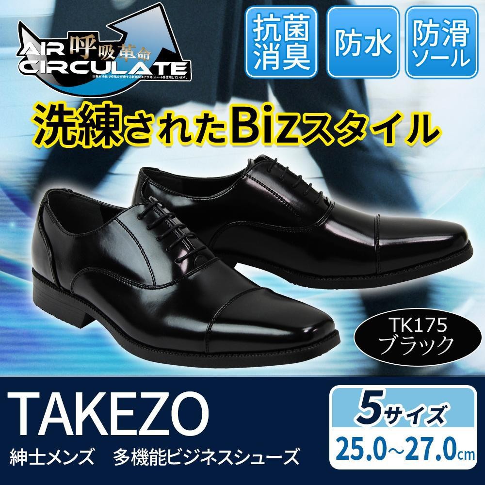 | 素材内部に施された通気構造により、靴の内部に滞った空気を外へ逃がし循環させる機能を持った新素材・エアサーキュレートを使用した、抗菌・消臭機能付きのビジネスシューズです。3cm防水仕様(メーカー防水試験合格)・滑りにくいソールなど、雨の日の通勤に便利な機能付き!! |