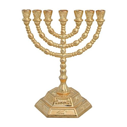 8" 7 Branch Hexagonal Base 12 Tribes of Israel Menorah by Bethlehem Gifts TM (Gold)