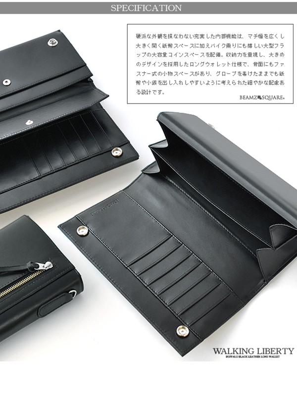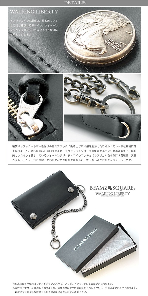 BEAMZSQUAREバッファローレザーシリーズにブラックカラー大容量ロングウォレット新登場! 硬質バッファローレザーを光沢のあるブラックに染め上げ素材感を生かしたワイルドでハードな風貌に仕上がりました。さらにBEAMZSQUAREバイカーズウォレットシリーズの象徴、アメリカの通貨史上最も美しいコインと評されているウォーキングリバティコインコンチョ(レプリカ)を本体に2個装備。 硬派な外観を損なわない、充実した内部機能はマチ幅を広くし大きく開く紙幣スペースに加え、バイク乗りにも嬉しい大型フラップの大容量コインスペースを配備。収納力を重視し、大きめのデザインを採用したロングウォレット仕様で、背面にもファスナー式の小物スペースがあり、グローブを着けたままでも紙幣や小銭を出し入れしやすいように考えられた細やかな配慮ある設計です。 真鍮ウォレットチェーンも付属しておりすべての拘りを網羅した、珠玉のハイクオリティウォレットです。プレゼントやギフトとしてもおすすめ。