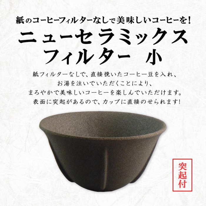 | 紙フィルターなしで、直接挽いたコーヒー豆を入れ、お湯を注いでいただくことにより、まろやかで美味しいコーヒーを楽しんでいただけます。表面に突起があるので、カップに直接のせられます! |
