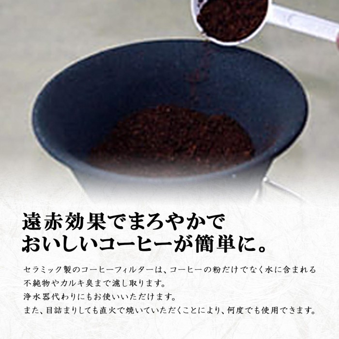 紙フィルターなしで、直接挽いたコーヒー豆を入れ、お湯を注いでいただくことにより、まろやかで美味しいコーヒーを楽しんでいただけます。表面に突起があるので、カップに直接のせられます! |