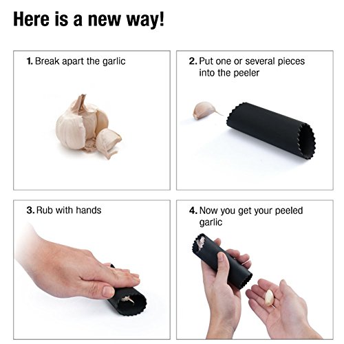 【3 in 1】This set includes one Garlic Press and one Silicone Peeler and one Cleaning Brush. Put the garlic in the silicon tube,rub and roll. You will get a garlic without skins.
