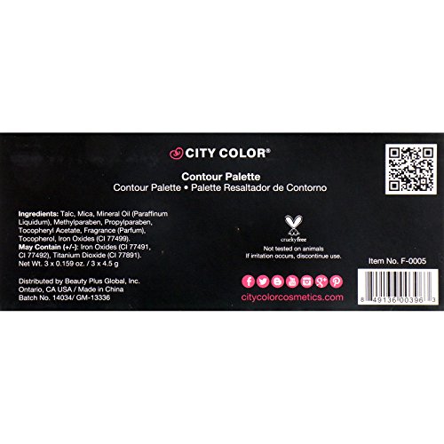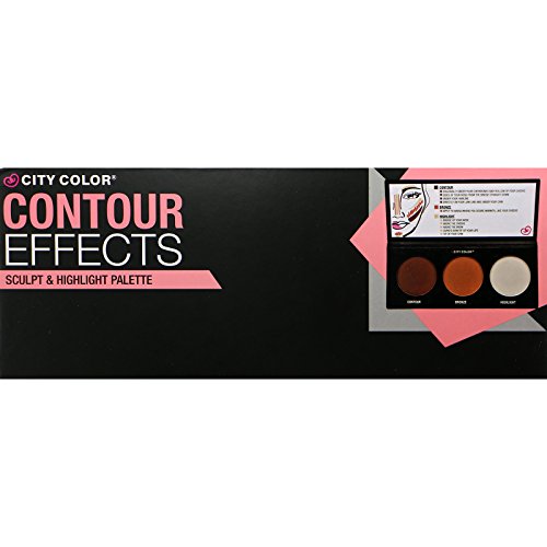 Studio : City Color Publisher : City Color Binding : Misc. Product Description City Color countour effects palette. Each set contains 3 different shades: contour, bronze, highlight. Net Wt. 3 × 0.159 oz. / 3 × 4.5 g. The Contour Effects Palette allows you to sculpt your face effortlessly with its easy-to-follow instruction guide. Achieve an ultra defined look with its matte contour and bronzer shades. Don't forget to let the light perfectly accentuate your cheekbones, forehead, nose and other features with its shimmer highlight. Our newly enhanced formula is highly pigmented and allows you to blend easily for an ultra flawless finish. Perfect for both beginners and professionals. Ideal for all skin types. Super high grade materials used in production. Provides cover up to the skin in any light. Gives a striking makeup results. Well coordinated and trendy color. Offers comfortable wear. Long lasting effect. Not tested on animals. If irritation occurs, discontinue use. 0