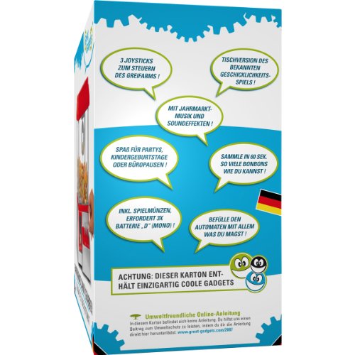 -. Feature : Originalgetreue Nachbildung der bekannten Jahrmarktattraktion / Behälter wird mit Süßigkeiten gefüllt, Greifarm wird mit drei Hebeln gesteuert / Zum Starten einfach beiliegende Spielmünzen einwerfen / Jeder Spieler hat 60 Sekunden Zeit um so viele Süßigkeiten wie möglich einzusammeln / Mit Jahrmarktmusik und Soundeffekten, erfordert drei Typ D Batterien (nicht im Lieferumfang enthalten)