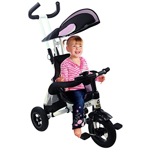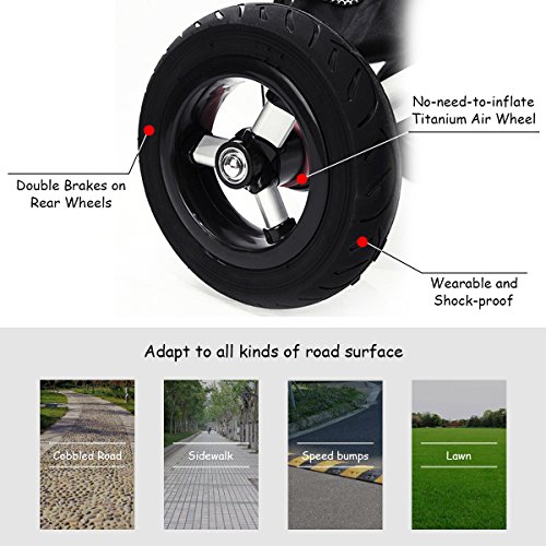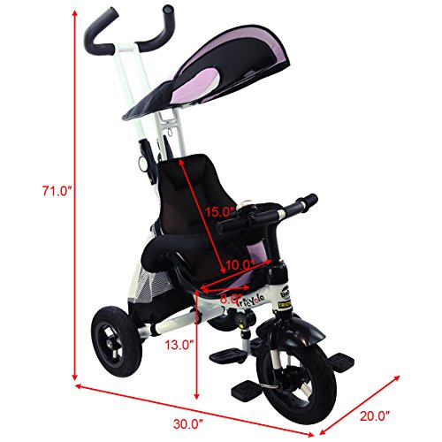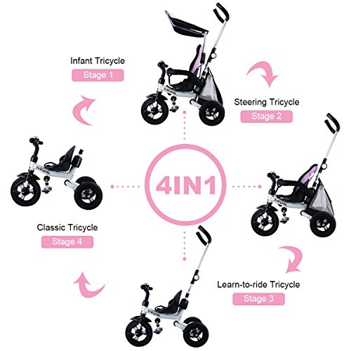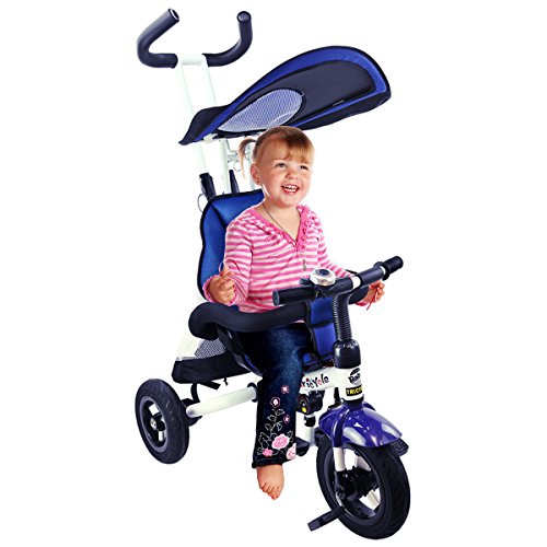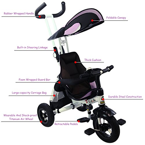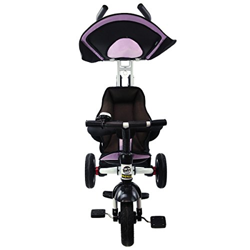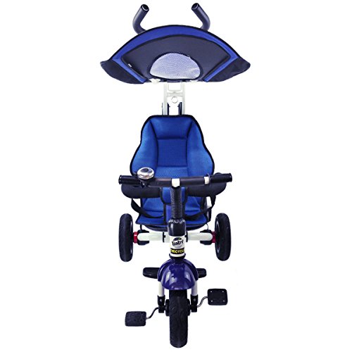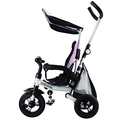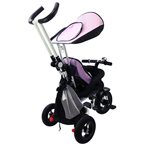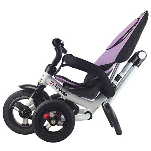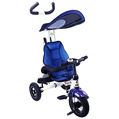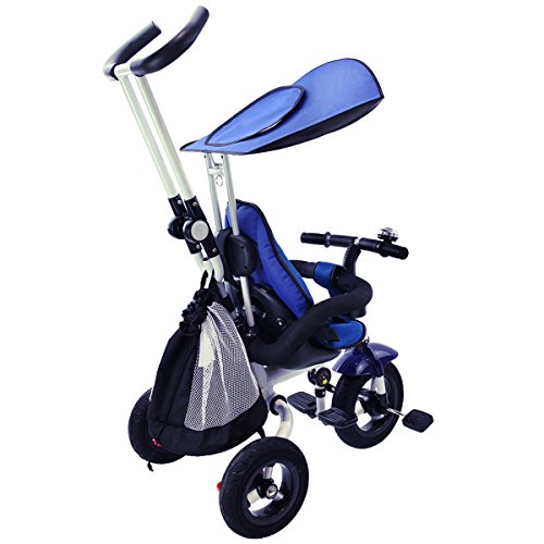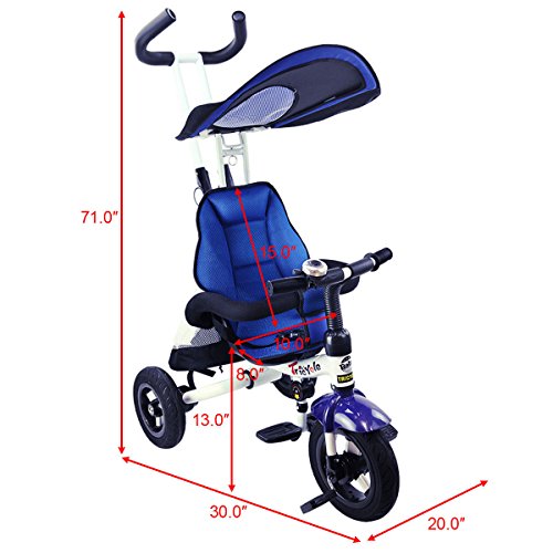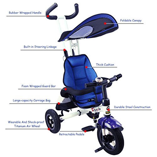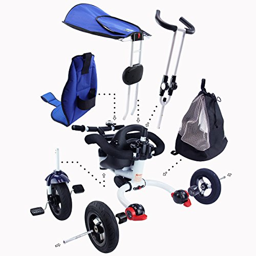 Description: This baby tricycle is perfect for your growing children aged from 1-5 years old and conveniently folds up for easy storage and transportation. It offers 4 ways to ride and easily converts from a stroller to a steering tricycle, learning-to-ride- tricycle, and finally a classic tricycle. This baby tricycle has a parent handle which can be used for steering and adjustable removable pedals to prevent baby's feet from being hit by front wheel. It features many secure designs, such as a safety belt to keep your little one safe, a padded handrail which is crash-proof and removable for baby to get on and off easily. Features: Can be assembled in 4 ways according to your kid's age Removable canopy for UV protection High-back seat for comfort and safety Foamed surrounded guardrail make it is crashworthy 2 brakes on back wheels for easy control and timely stop Free aeration titanium air wheel is anti-wear and could decrease vibration Back Foldable Footrest, Pedals become footrests for early stages Large-capacity back hanging bag could be detached for individual using Specification: Color: Blue Material: Carbon steel PP/ABS plastic Oxford cloth Overall dimension: As picture shown Suitable Age for 1 - 5 years old Weight Capacity: 55 lbs Package includes: 1 x Tricycle 1 x Instruction 0 |