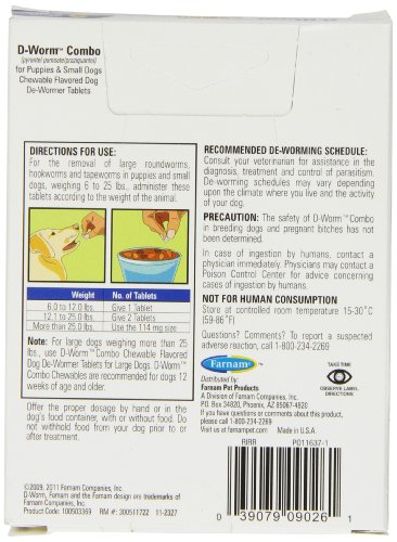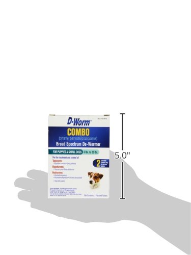 D-Worm Combo is a broad-spectrum de-wormer with active ingredients that help treat and control tapeworms, roundworms, and hookworms. This product is for use in puppies and small dogs of 12 weeks of age or older and of 6 pounds to 25 pounds, and it contains 2 chewable flavored dog de-wormer tablets. Consult your veterinarian for assistance in the diagnosis, treatment, and control of parasitism. Please refer to package insert.Feature