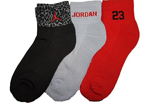 -. Feature : AIR JORDAN ELEPHANT P.R.INT BOYS 3 PAIR QUARTER SOCKS / SIZE 9-11/ 5Y-7Y / COLOR:Black/Grey/Red / The socks are 98% poly blend / 2% spandex and can stretch a bit.