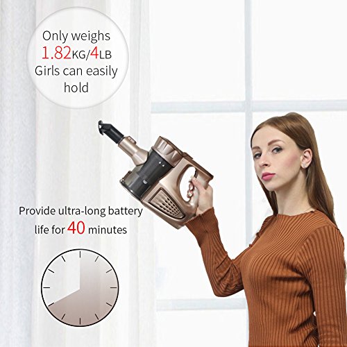 PARAMETERSWEIGHT: 1.82KG/4LBRATED POWER: 110WCAPACITY: 0.7LBODY SIZE: 12*4.3*8 INWORKING VOLTAGE: 22.2VDCBATTERY TYPE: 2200mAh lithium batteryINPUT: 110VAC, 50/60HZ, 0.6AOUTPUT: 26.5VDC, 500mA FINE WORKMANSHIP: - The shell of device is made of aluminum alloy which is high density, non-corrosive and scratch resistance.- It has multi-cone gas-solid separation technology, lightweight and easy operation and simple buckle assemble and disassemble methods.- It fits 2200MA lithium battery which could provide 40 min super long battery endurance ability. - The dust bin, filter net and filter sponge in device are washable and both available for dry and wet usage. - Five precision filtering layers including dust bin filter, honeycomb filter, four-cone wind filter, antibacterial cotton filter, and weave cotton filter to ensure the dust will be well collected. FUNCTION: - The vacuum cleaner free you from traditional way of cleaning, make the whole cleaning stuff more relax and faster. You need not to sweep the floor by taking a broom and a dustpan, and waste a lot of time empty the dust from dustpan again and again. Save your time to create more leisure time to do other things. Also, the whole cleaning thing become less tired and more pleasant, cost less energy to make your home clean and bright.- The wireless design opens a creative new lifestyle. Compared with wired one, you need not to busy finding sockets in every room and need not always worry about the power line is not long enough for you to clean some small corners. Besides, the wired one would have potential risks that family members will be tripped over by power line on the floor, especially for elders and children. Our product could free you from these concerns and use it more relieved.Attention: There is no roller brush at the bottom.Feature