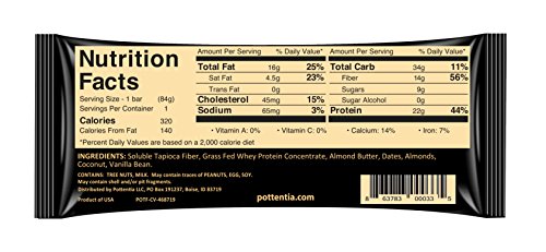 Studio : Pottentia LLC Publisher : Pottentia LLC Binding : Health and Beauty Product Description Grass Fed Whey Protein 20g , Coconut Vanilla, High in Pre-Biotic Fiber, Artificial Free;Gluten Free, GMO Free, Antibiotic Free, Hormone Free, Additive Free, No Artificial Sweeteners;Preservative Free, Sugar Alcohol Free, Color Free, Bigger than Average Bar (85g), With Organic Ingredients;Great for CrossFit, Hiking, Bodybuilding, Cycling, and Running, Use as Snack or Meal Replacement;Made in USA, 8 Large 85g Bars, Simplest and Healthiest Ingredient list, See Below. 0