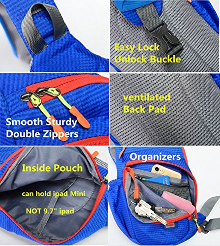 -. Feature : Made of water resistant nylon, durable , soft, comfortable and light weight. / Water bottle holder,(Water Bottle Diameter should NOT over 2.5 in) , Inside Secure Zipper Pocket / Zipper pockets organized your things well and easy to reach. / Main Compartment can hold regular ipad, small umbrella, wallet and other S\small stuff / Wider and soft strap lessen burden to your shoulder, make it more comfortable to wear.