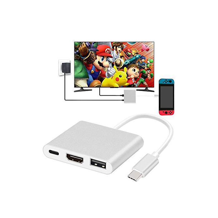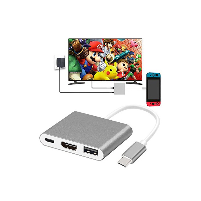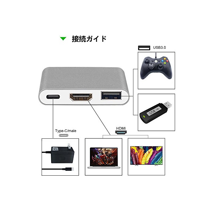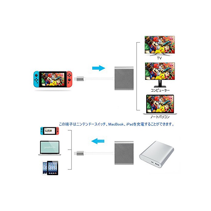 「3개의 포토」:본체에는 USB포토,HDMI포토,Type-C포토가 각 하나 탑재되어 있습니다. 닌텐도 스위치 본체,Type-C노트 PC,Samsung Galaxy S8등에 대응 하고 있습니다. 더 커다란 스크린에 닌텐도 스위치가 플레이 가능합니다.또한 닌텐도 스위치,MacBook,iPad를 충전할 수도 있습니다.