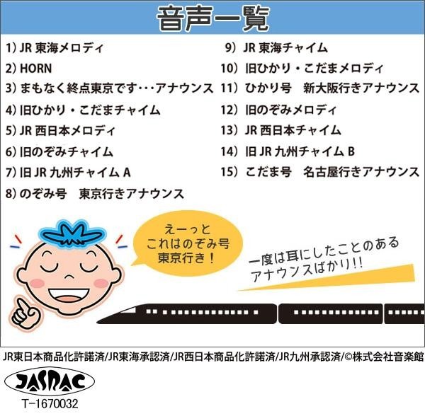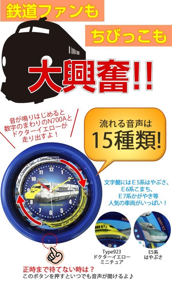 毎時、N700Aとドクターイエローのミニチュア模型が回転し、15種類の車内アナウンスやメロディが流れます。文字盤周りにはE5系はやぶさ、E6系こまち、E7系かがやきをはじめとする人気車両がデザインされています。まるで新幹線に乗った気分になれる掛け時計です♪ |