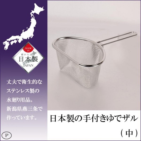 新潟県の燕三条で作られた、日本製の手付きゆでザルです。
