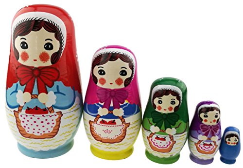 -. Feature : Shy little girl with red riding hood is holding an apple basket.It's cute and delightful / Each doll is different color.It's stoving varnish,so the color is brighter / Contains 5 dolls with decreasing size placed one inside the other to appear as one / Not only is a special toy to kids,but also a unique storage box for them to hide their little things / Nesting dolls is full of special meanings,it's a perfect gift to give anyone and special decoration
