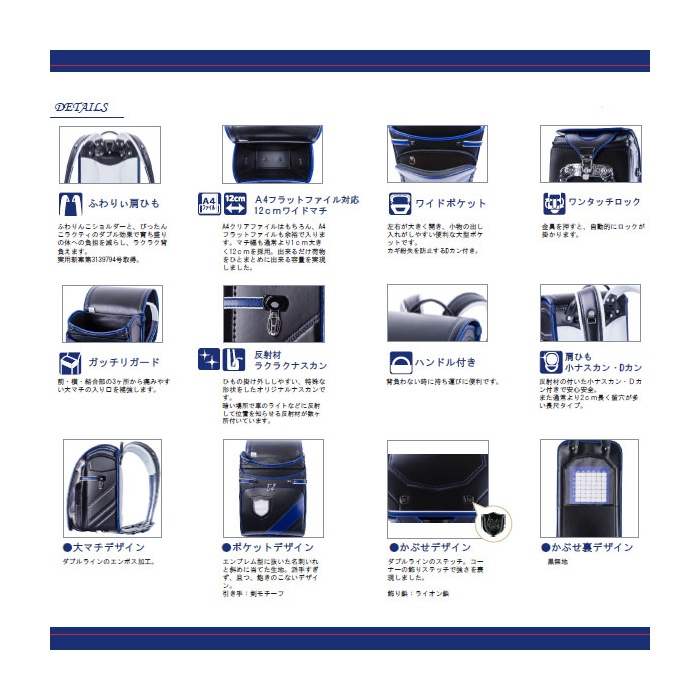 쿨한 블랙&블루로 빛나는 엠블럼이 근사한 란도세루(초등학생이 어깨에 매는 가방)의 등장입니다.