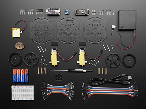 This project contains just about everything you need to make your very own Bluetooth controlled mini-robot, with the added bonus of a temperature & humidity sensor! You get a Feather Bluefruit LE (Arduino compatible microcontroller with Bluetooth LE radio), motor control wing, HTU21D-F temperature & humidity breakout board, three-layer round robot chassis, two motors, two wheels, a battery pack + 4 x AA batteries, a lithium ion battery, breadboard and a nifty pocket screwdriver!