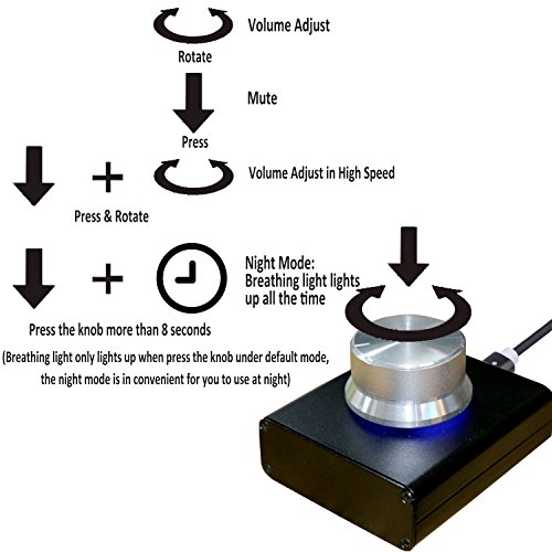 A breathing light built under the volume knob; In default mode, the breathing light only lights on under every pressing on the knob; If you want the breathing light lights on all the time especially at night, long-press the knob for more than 8 seconds then the volume controller will be set to night mode