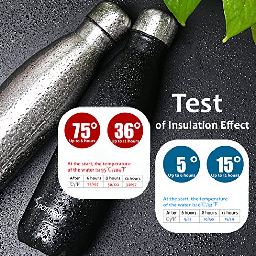 -. Feature : UP TO 12 HOURS INSULATION: Unique double walled vacuum insulation design with vacuum-seal cap keeps your drinks hot or cold for up to 12 hours / FOOD GRADE SAFE: Good grade leak-proof & scratch-resistant 18/304 stainless steel body both inside and outside, 100% BPA free, FDA approved / SPECIALLY DESIGNED CAP AND MOUTH: Specially designed cap to prevent spills/leaks, and wide mouth design allows accommodating ice cubes/ fruit infusions / 17OZ /500ML CAPACITY, BUT LIGHTWEIGHT: Weighs just over half a pound, lightweight and easy to take on the go, perfect for outdoor activities, the gym, long hikes, treks, bike rides, hot yoga classes, long road trip, in your car or backpack / BUNUS: This water bottle comes with a free black bottle cover with a carrying strap for portability, and also, a brush is included for easy cleaning