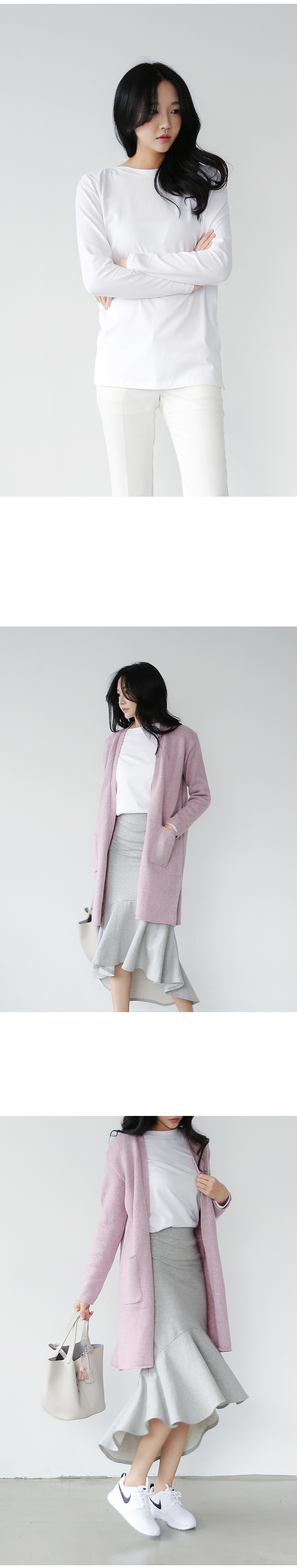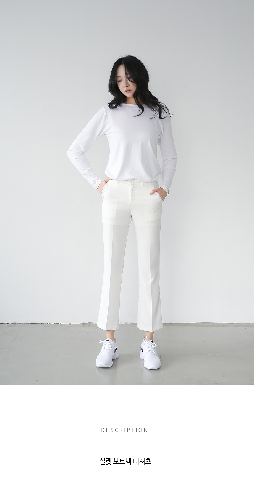 정갈한 보트넥의 깔끔하게 떨어지는 목선과 전체적으로 바디라인 따라 흐르는 과하지 않은 핏이 편안한 제품이에요