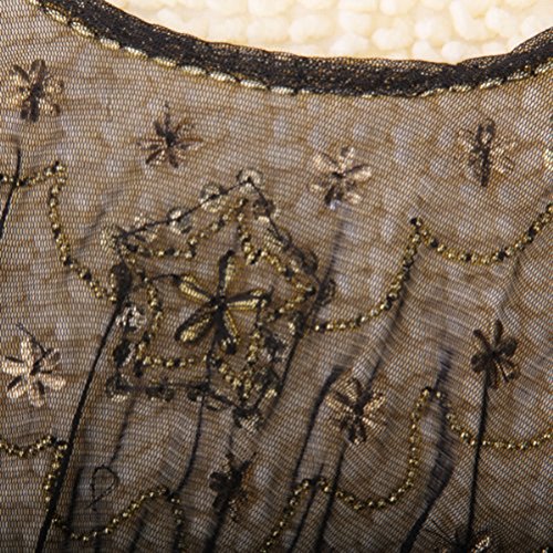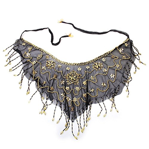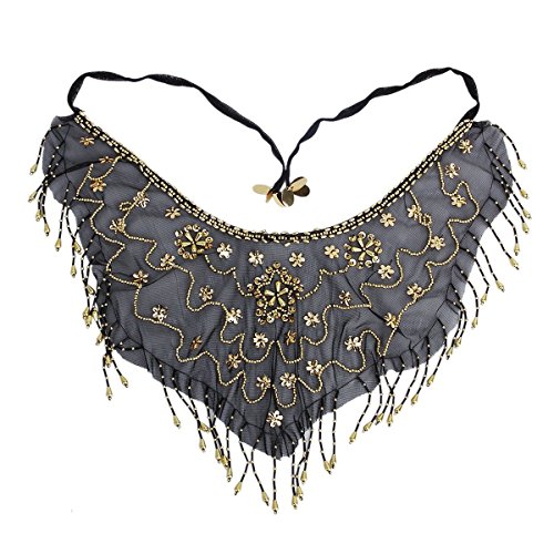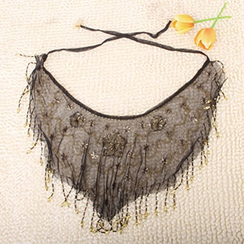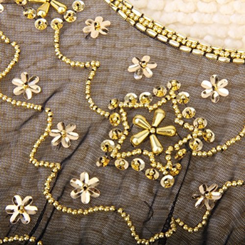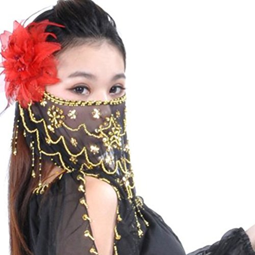 -. Feature : Color: Black. Material: fabric + Beads + Sequins. / L x W: Approx. 22 x 106 cm 8.7 x 41.7 inch. / Beautiful face veil with gold beads and sequins decorations. / Suit for a variety of styles dance. / Mysterious and temptation.