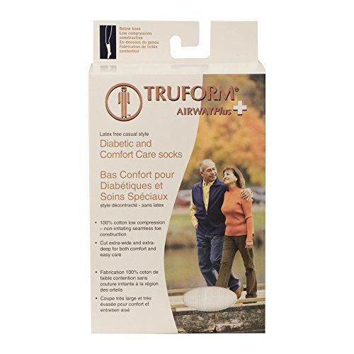 ReleaseDate : 2013-10-15 Studio : Truform Publisher : Truform Binding : Health and Beauty Product Description Comfort Care casual socks are designed for anyone with special needs in foot care. Non-constricting, gentle, elasticity helps keep sock in place to prevent bunching and sliding. The natural cotton materials helps reduce irritation and blistering and provides exceptional comfort, easy care and excellent absorbency. Suitable for men and women - ideal for the diabetic patient, or anyone with sensitive feet issues. Truform stockings, socks and pantyhose feature Graduated Compression Technology, which delivers a compressive action to the leg that is greatest at the ankle, then gradually decreases toward the heart. The amount of compression is expressed as mmHg (millimeters of mercury). Graduated compression provides two primary benefits to the legs. Firstly, increased pressure on tissues beneath the skin helps reduce leakage of fluid from the capillaries and helps increase the return of fluid to the capillaries and lymph vessels, reducing and preventing swelling for the wearer. In addition, compression stockings help control the size (diameter) of the superficial veins that lie just beneath the skin, preventing the slowing of blood flow and blood "pooling" so it can flow more quickly up the leg back toward the heart. Truform graduated compression support hosiery works in concert with your body to help maintain good circulation and leg health. Truform combines the best materials, the latest methods of semi-automated manufacturing, and "old-worlde" hand craftsmanship to produce a high-quality product at affordable prices. Multiple quality assurance checks are performed throughout our entire manufacturing process to insure comfort, fit, durability, and an accurate, therapeutic, graduated compression profile. We take the extra time and effort necessary to insure a therapeutically effective, comfortable fit. The combination of state-of-the-art materials and equipment, plus knitting "know-how" sets Truform apart from the crowd to make your legs look and feel great! 0