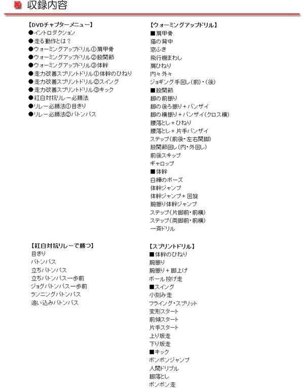 このDVD「新・運動会で1番になる方法」では肉体構造・トレーニング法を逐次しっかりと理解しながら取り組むことをテーマにしています。しっかりとしたフォームを身につけ、効率良く、無駄のないトレーニングになるよう、一緒に取り組んでいきましょう。100m日本記録保持者伊東浩司先生による「運脳神経のつくり方」(DVD)も合わせてご覧ください。